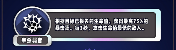 ได้รับอัตราการเข้าชมวิกฤตสูงสุด 75% ตามสุขภาพที่สูญเสียโดยเป้าหมาย ทุก ๆ 3 วินาทีโจมตีศัตรูด้วยสุขภาพที่ต่ำที่สุด